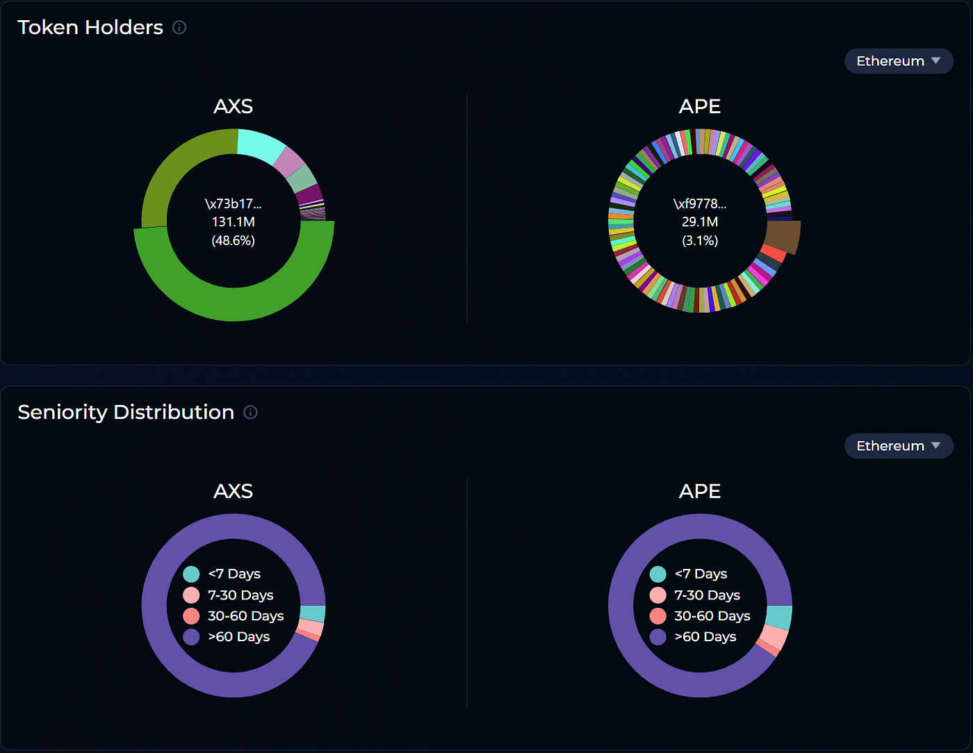 Let’s say you wanted to compare projects. All you have to do is enter the token names you want to compare in the search bar. For example, you want to pit Axies Infinity against Ape Coin and against Decentraland to see which has the most promising return rates for you. Our tool will give you all of the metrics you’re used to seeing on the single pages, but it will allow you to quickly see exactly where AXS stands in comparison to MANA and APE on token price, trading volume, social followings and more.